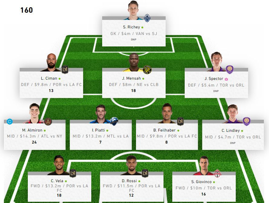 Gyasi Zardes (CLB, $8.3) scored three goals in two matches on the way to 22 points, leading all forwards and all players. Behind him, Carlos Vela (LA, $13.2) tallied a goal and an assist for 18 points, and Sebastian Giovinco ($10.0) did the same for 16 points, despite getting a dumb red card. Darren Mattocks ($6.4) led the United forwards with 2 points, followed by Bruno Miranda ($6.2) with 1.