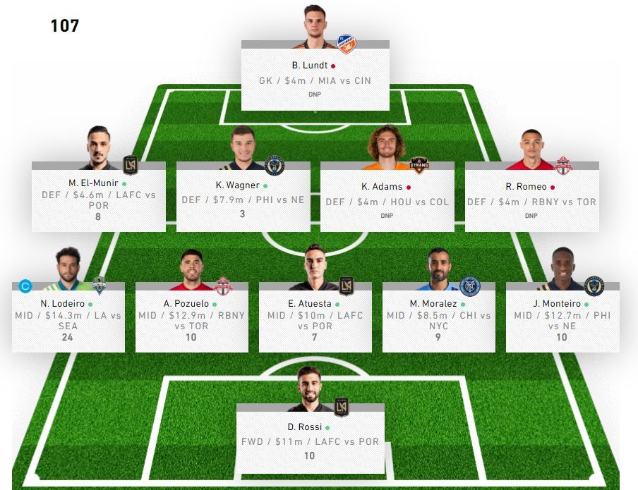 Seattle’s Nouha Tolo ($7.4) led the defenders with 17 points on a clean sheet and an assist, followed by Aaron Long (NYR, $8.2), who paired a goal and a clean sheet on the way to 16 points. Jorge Villafaña (POR, $9.2) rounded out the top three with an assist, a clean sheet, and 13 points. The D.C. defense featured Donovan Pines ($8.1) with 8 points, followed by both Frederic Brillant ($6.1) and Oneil Fisher ($4.0) with 7 each, and Joseph Mora ($6.6) with 6.