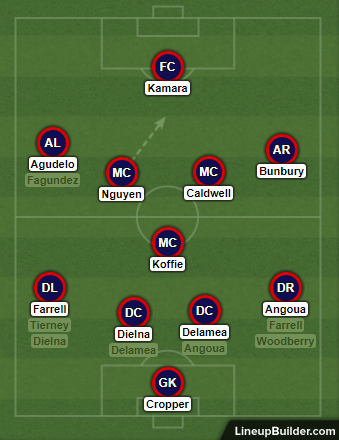 On the left, normally we’d be seeing Diego Fagundez, but he’s listed as questionable after taking a blow to the head in stoppage time last week. If he’s not ready to go, Heaps will probably lean on Scott Caldwell. Caldwell isn’t a natural fit in this role, but without Rowe, no one else is either. This may be the biggest influence on moving to a 4141 or 4231, with Agudelo playing wide left and Caldwell joining a central midfield trio instead of going with two forwards.