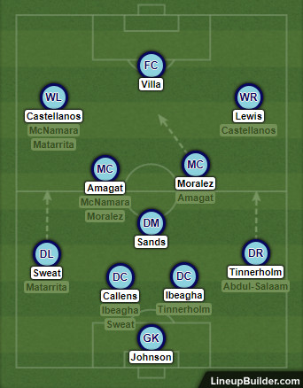 In the case of a diamond being trotted out again, Villa and Castellanos will pair up as the forwards. Moralez would slot in as the #10, with Amagat and Matarrita (or possibly McNamara) in shuttler roles ahead of Sands. It probably depends on whether Torrent wants an open, transition-filled game, which favors the 433, or if he’d like to focus on stringing together possession while packing central midfield in the diamond.