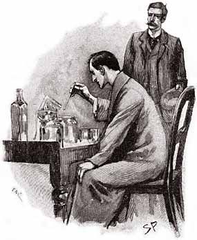 Back, safely undetected, in our First Class stateroom, Holmes unpacked all the accoutrements for extensive chemical analyses that he had brought from Baker-street. He opened the bottle of trinkenenergie rotstier, sniffed it carefully, took one drop cautiously on his tongue, and began a long series of chemical tests. After several hours, he leaned back from his test tubes, flasks, and flame.